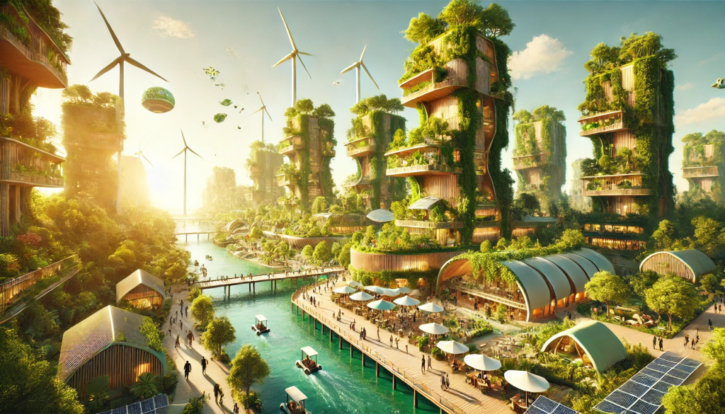 Au premier plan, une rivière aux eaux limpides sur laquelle circulent quelques bateaux-taxi propulsés à l’hydrogène. Sur chacune des rives, des immeubles végétalisés absorbent la lumière douce du soleil couchant. Sous de vastes auvents de bois, des badauds prennent un verre en regardant passer les voitures volantes entre les pales des éoliennes qui tournent doucement à l’horizon. Comme la croissance verte est belle…